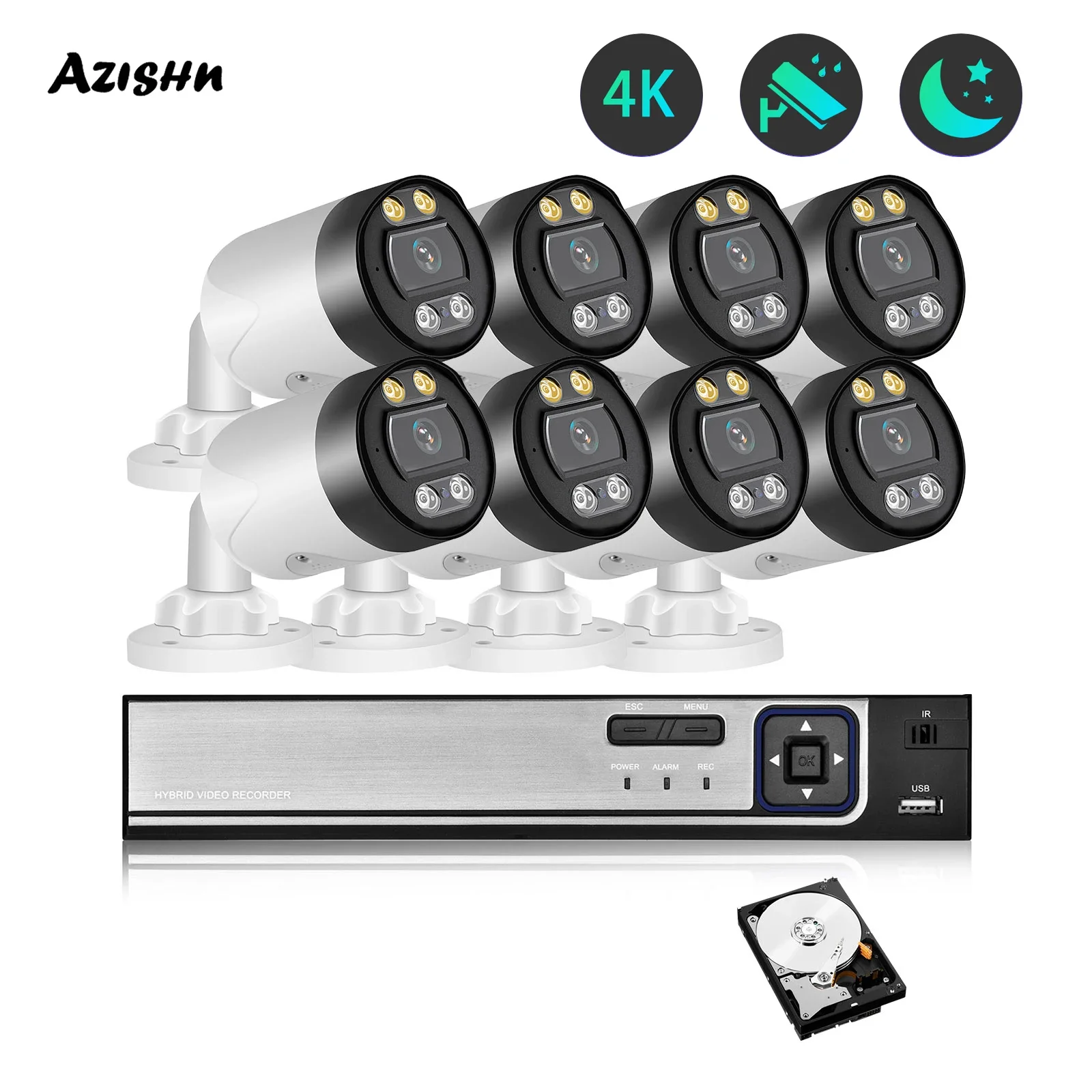 Azishn 8MP 4K IP Bullet Camera 8CH NVR CCTV System Kit Outdoor ...