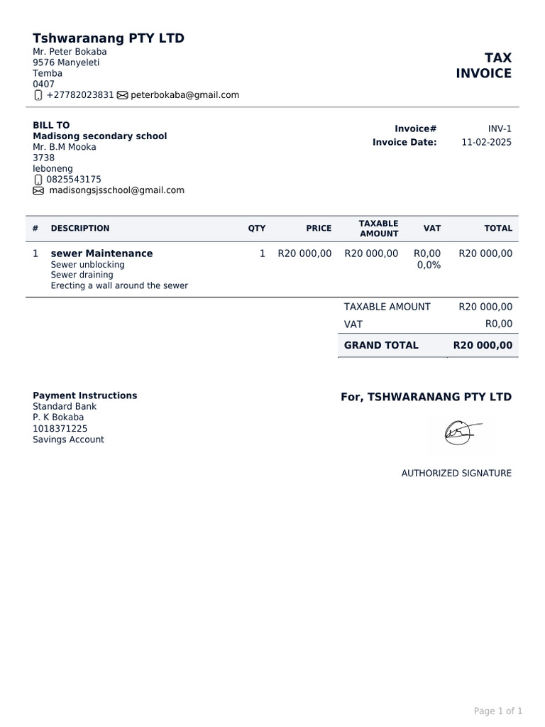 Tshwaranang PTY LTD TAX Invoice: Bill To Madisong Secondary School ...