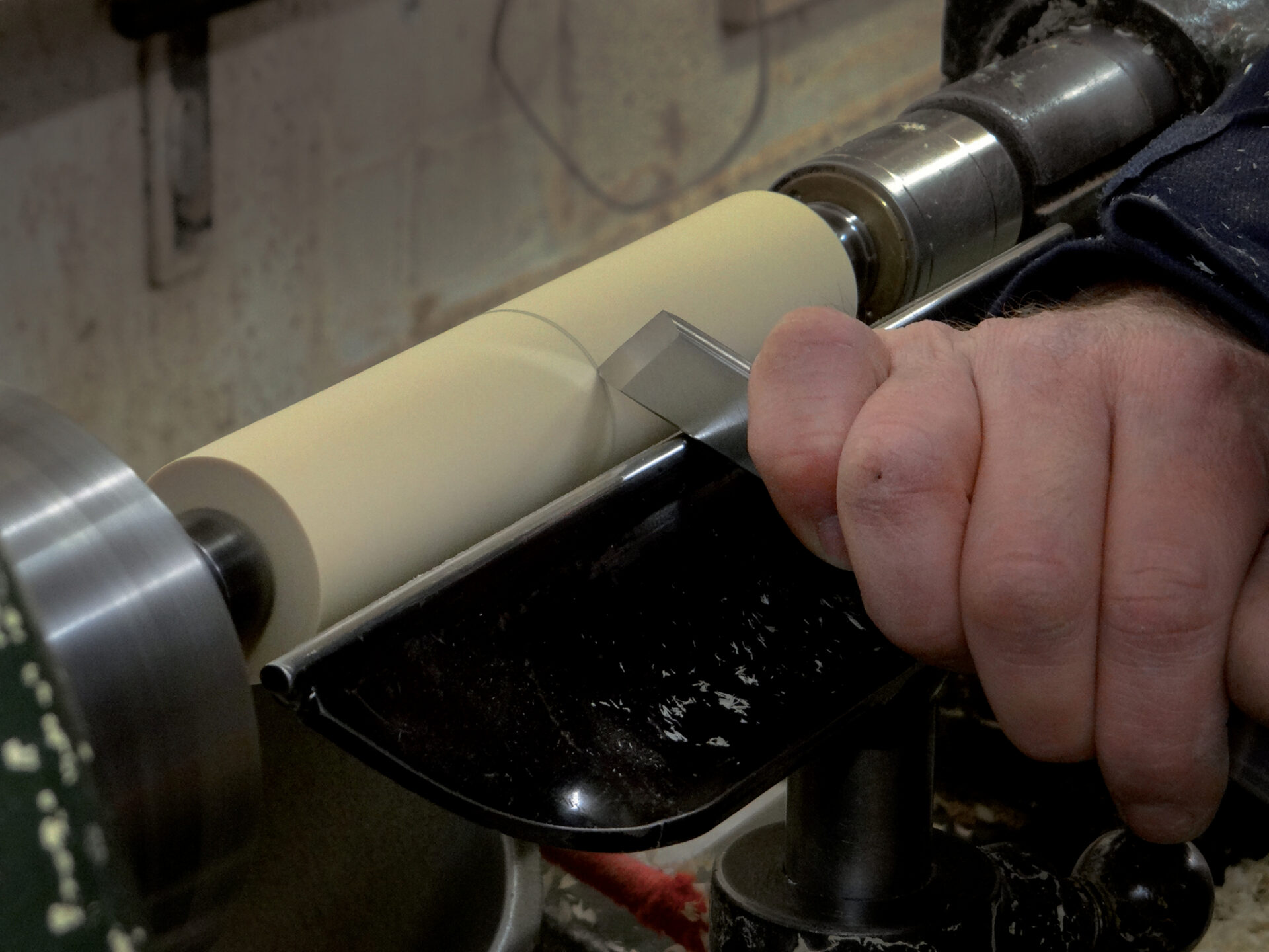 A craftsman using a chisel to carve out a deep groove in a piece of ...