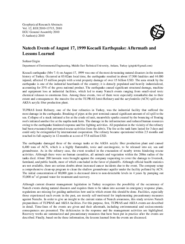 (PDF) Natech Events of August 17, 1999 Kocaeli Earthquake: Aftermath ...