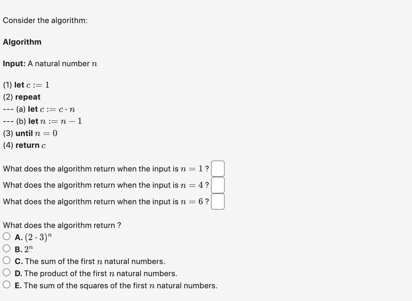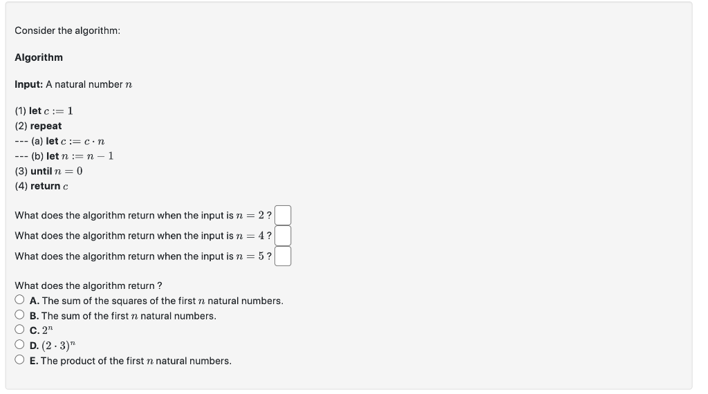 Solved Algorithm Input: A natural number n (1) let c:=1 (2) | Chegg.com