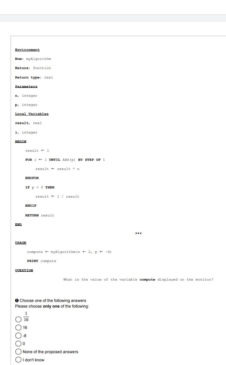 Solved Environment Nom: myAlgorithm Nature: function Return | Chegg.com