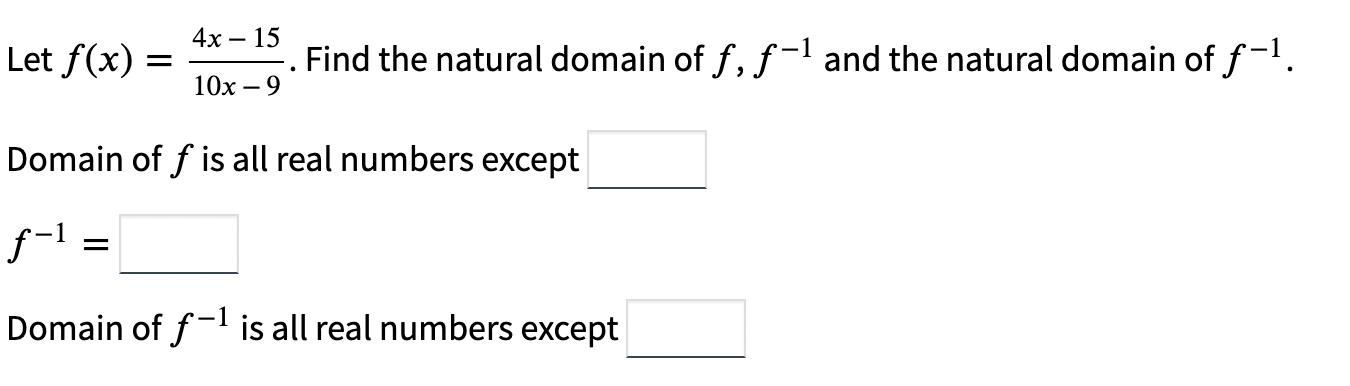 Solved Let f(x)=10x−94x−15. Find the natural domain of f,f−1 | Chegg.com