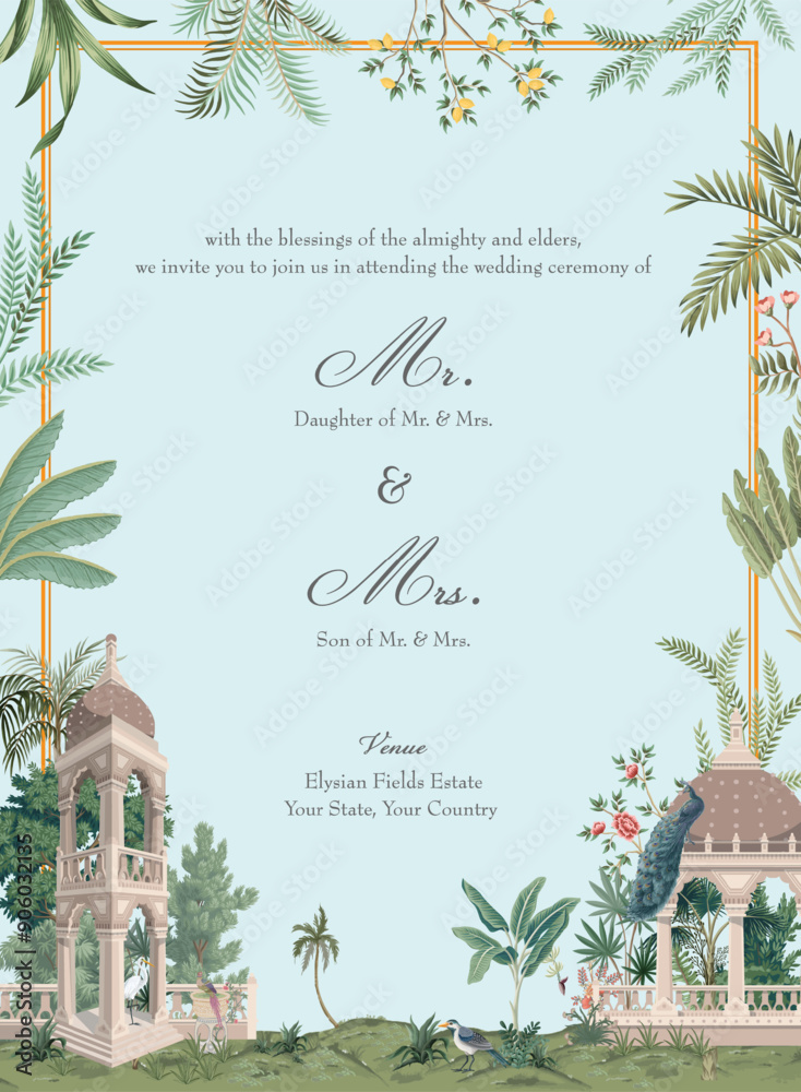 Mughal garden wedding invitation card design. Tropical trees, flowers ...