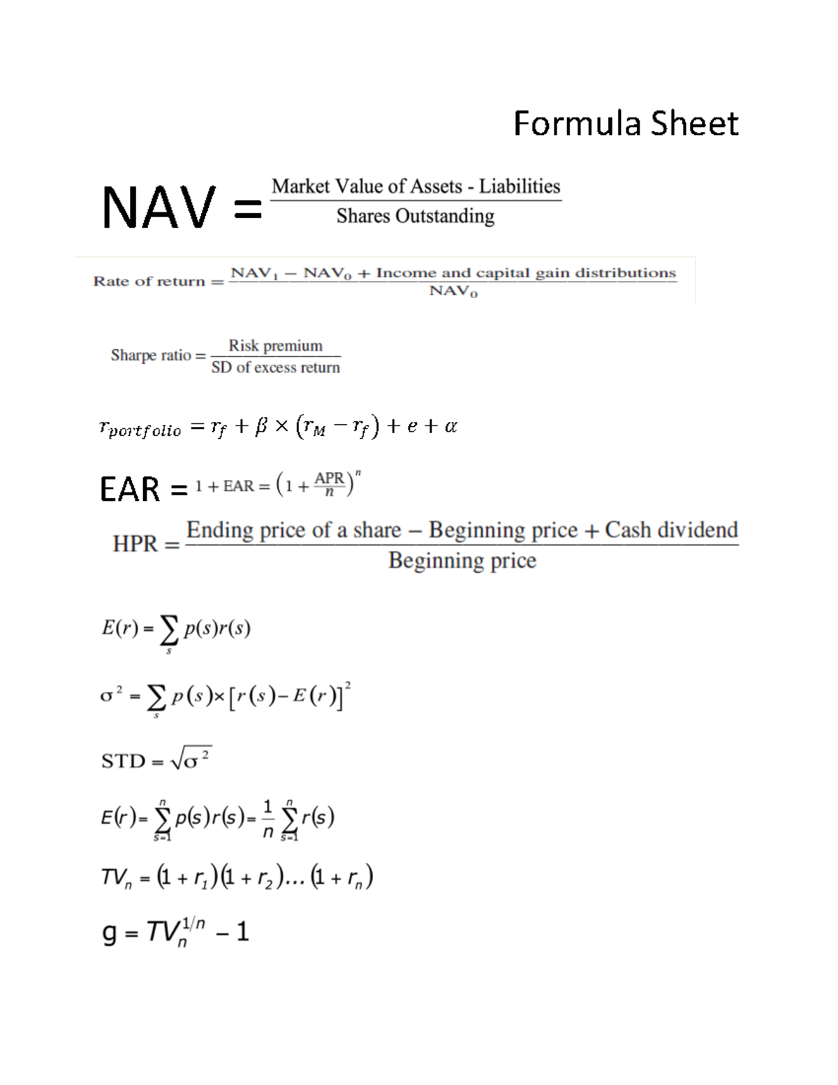 Formula Sheet - Formula Sheet NAV = EAR = ๐!"#$%"&'" = ๐% + ๐ฝ ร &๐( โ ๐ ...