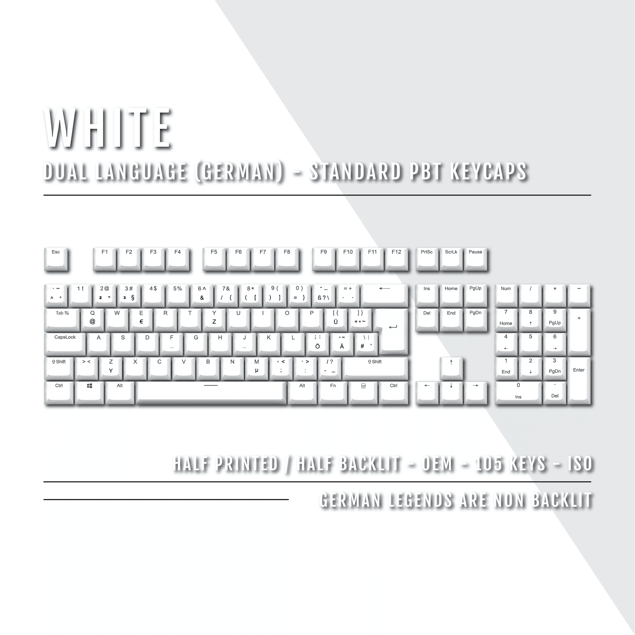 White PBT German Keycaps - ISO-DE - 100% Size - Dual Language Keycaps ...