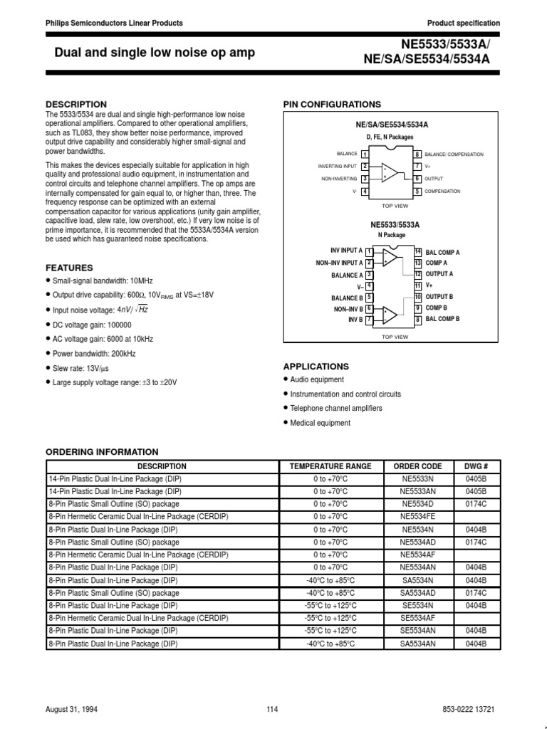 NE5533 Datasheet PDF , Philips Electronics : Dual and single low noise ...