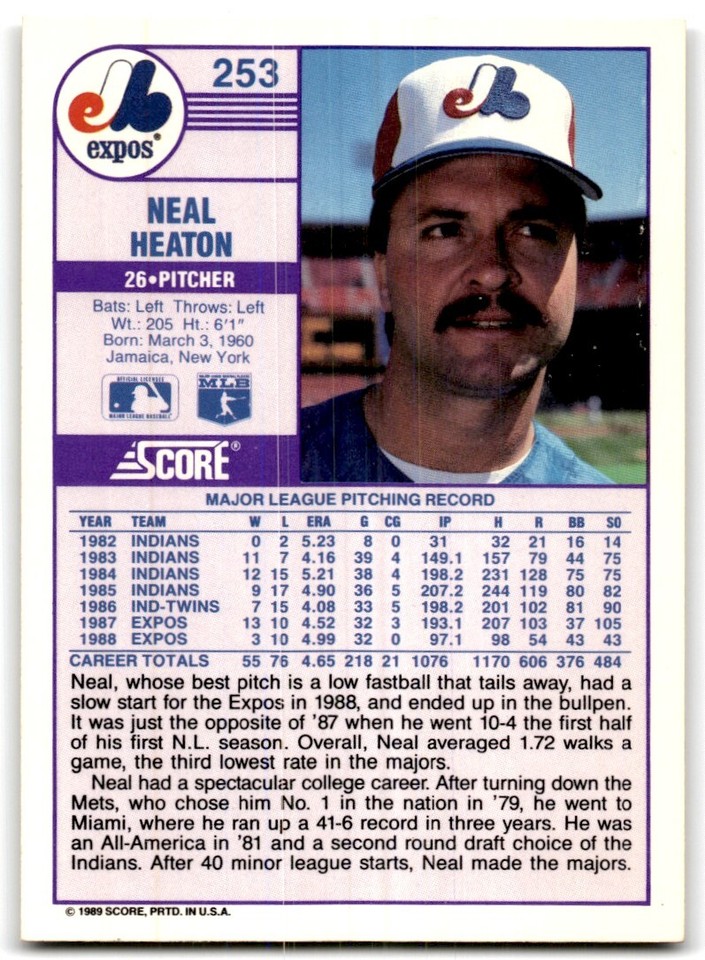 1989 Baseball 1989 Score Neal Heaton Montreal Expos #253 1 | eBay