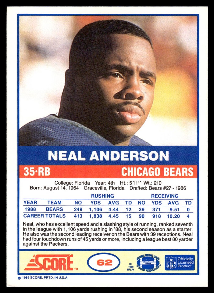 Neal Anderson 1989 Score #62 Chicago Bears | eBay