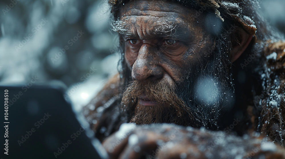 Neanderthal Man Using Mobile Device Curiously Bridging Ancient and ...