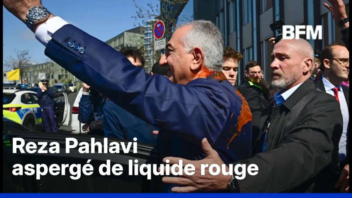 Reza Pahlavi aspergé par un liquide rouge à l'issue de sa conférence de ...