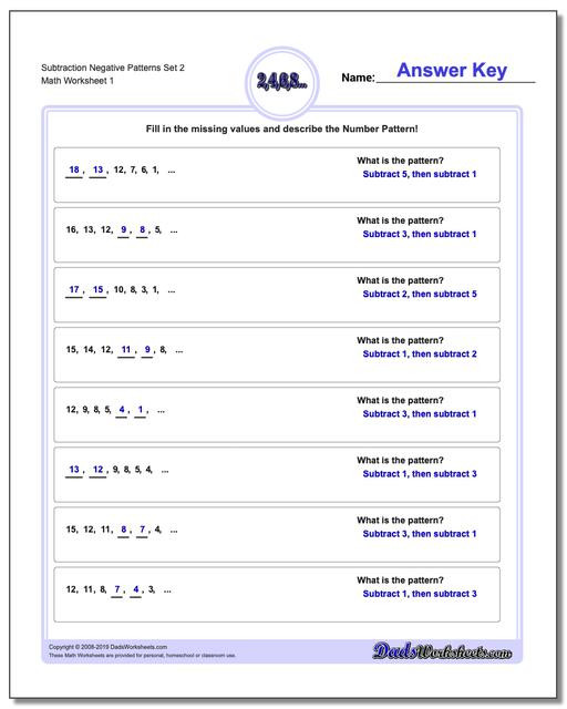 Negative Number Pattern Worksheets. Subtraction patterns leading to ...