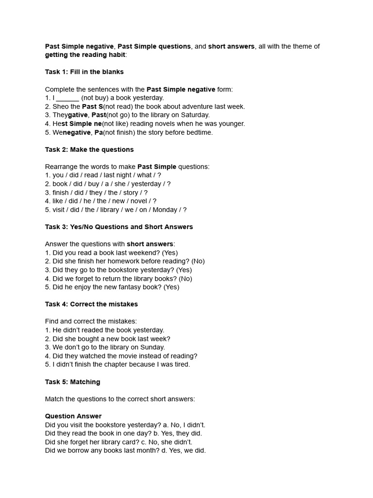 Past Simple Negative, Past Simple Questions, And Short Answers, All ...