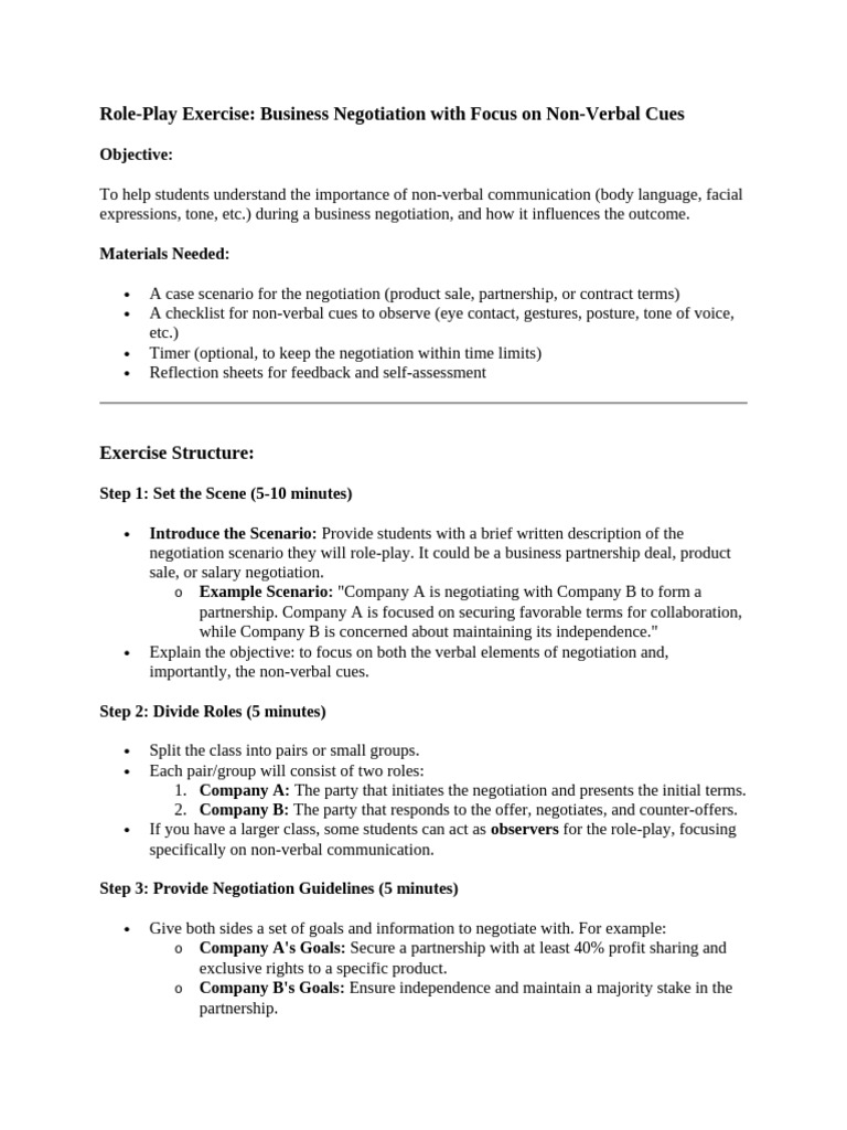 RolePlay Exercise Business Negotiation With Focus On Non-Verbal Cues | PDF