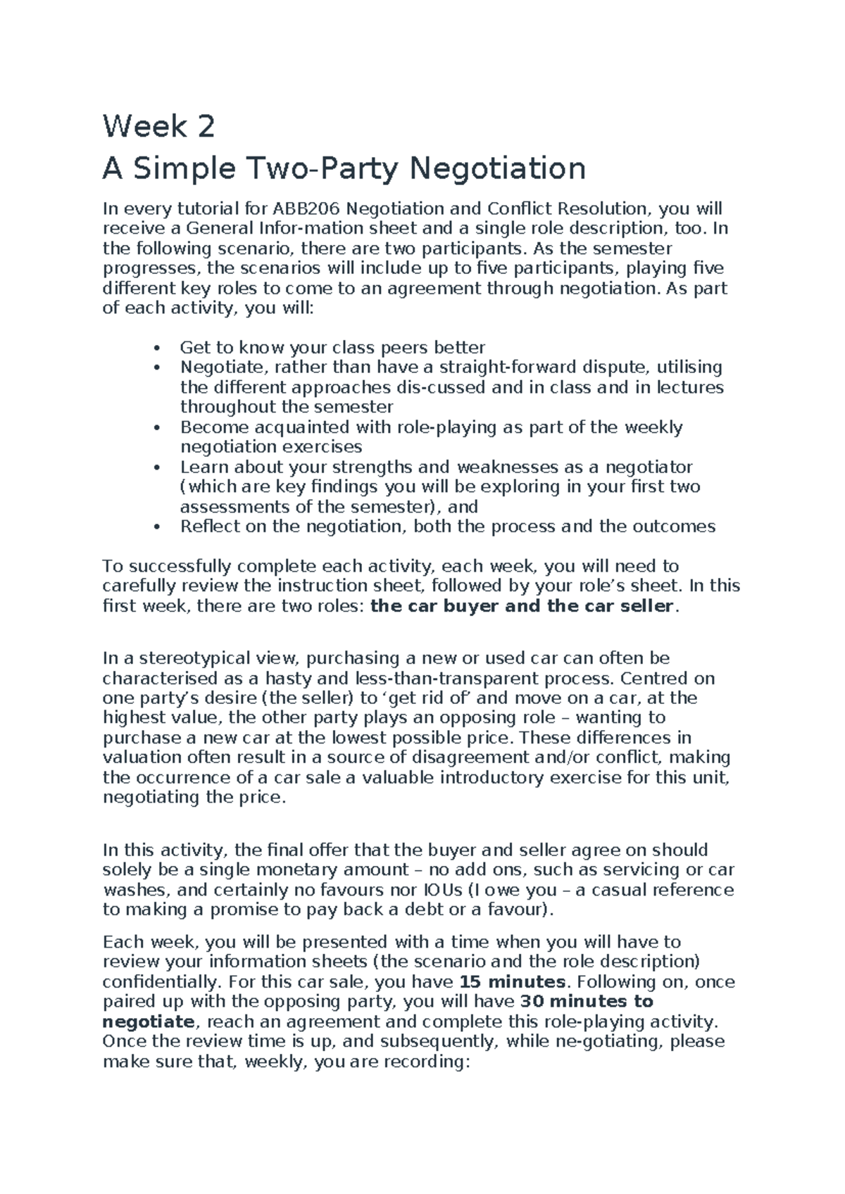 ABB206 Week 2 Negotiation Exercise: Car Buyer vs. Seller Roles - Studocu