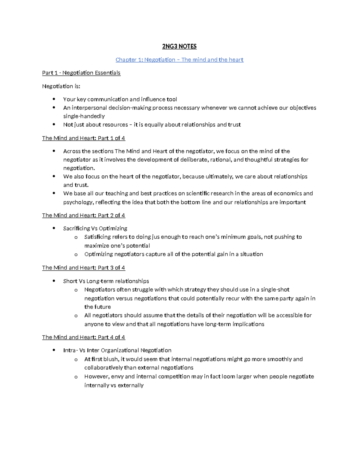 negotiation Notes - 2NG3 NOTES Chapter 1: Negotiation – The mind and ...