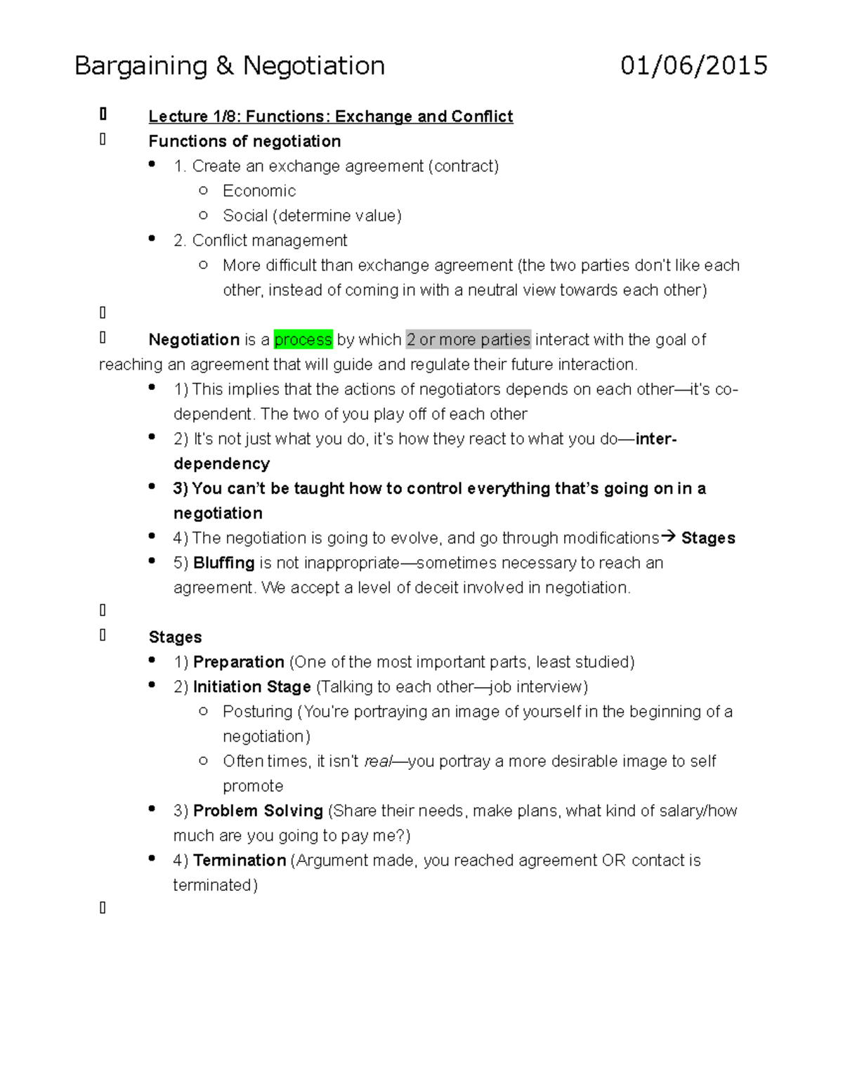 Class 08 Notes Negotiation - Class 08 Notes: Conflict and Negotiation ...