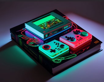Neon blue and pink phone case with party scene on screen with iPad and ...