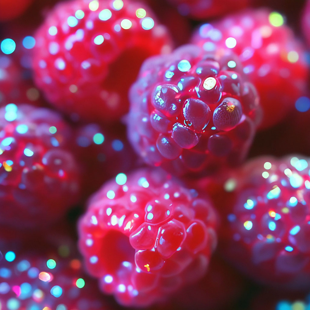 "Lots of glass raspberries, fine details, clarity, neon, glitter,4k ...