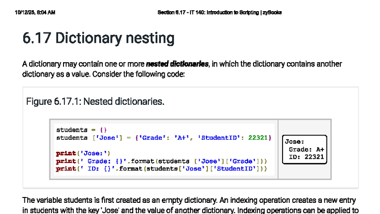 IT 140: Nested Dictionaries in Scripting I - zyBooks Section 6.17 - Studocu