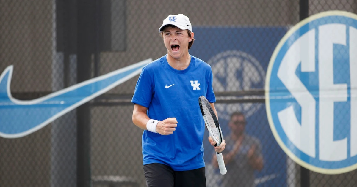 Kentucky men’s tennis star Eli Stephenson won a point by jumping over ...