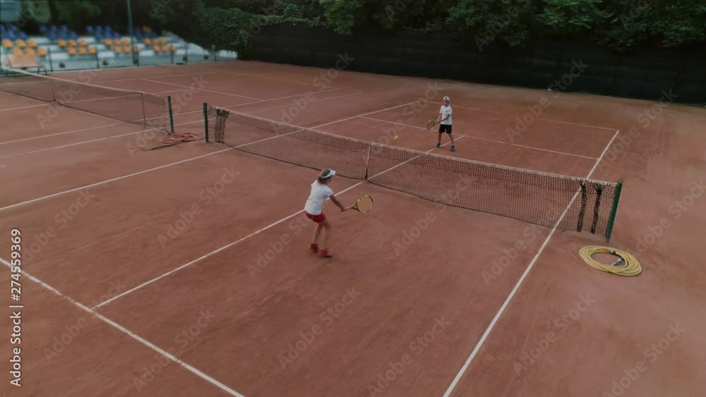 children tennis, skillful sports players teen boy and girl play tennis ...