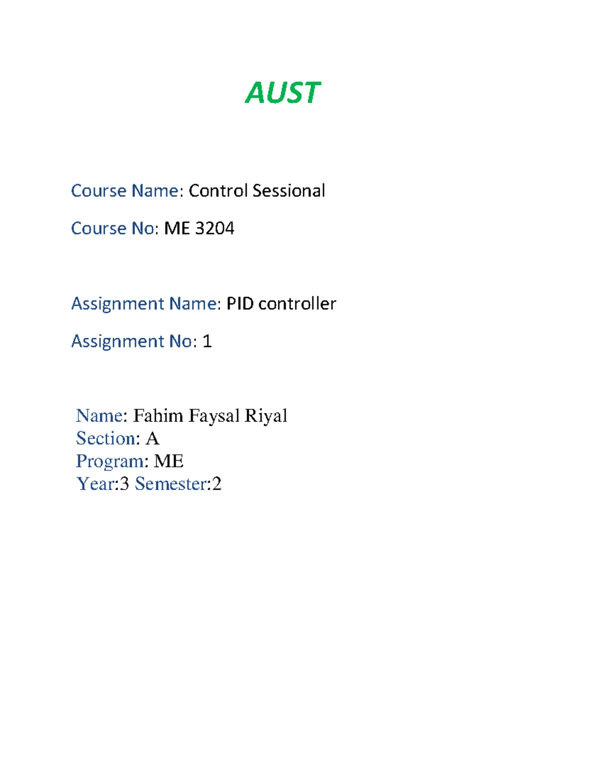 ME 3204 PID Assignment 01 - AUST Course Name: Control Sessional Course ...