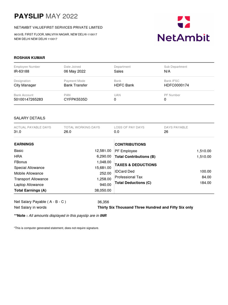 NetAmbit Valuefirst Services Private Limited Payslip Word And Pdf Template
