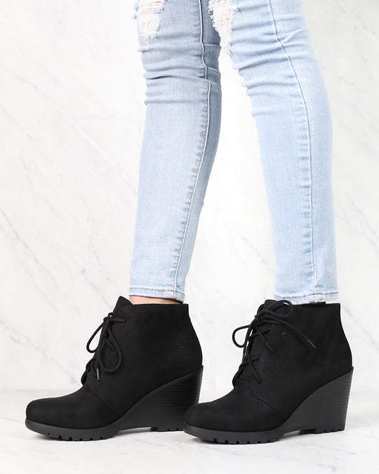 Not So Far Fetched Lace-Up Wedge Ankle Booties in Black – Shop Hearts