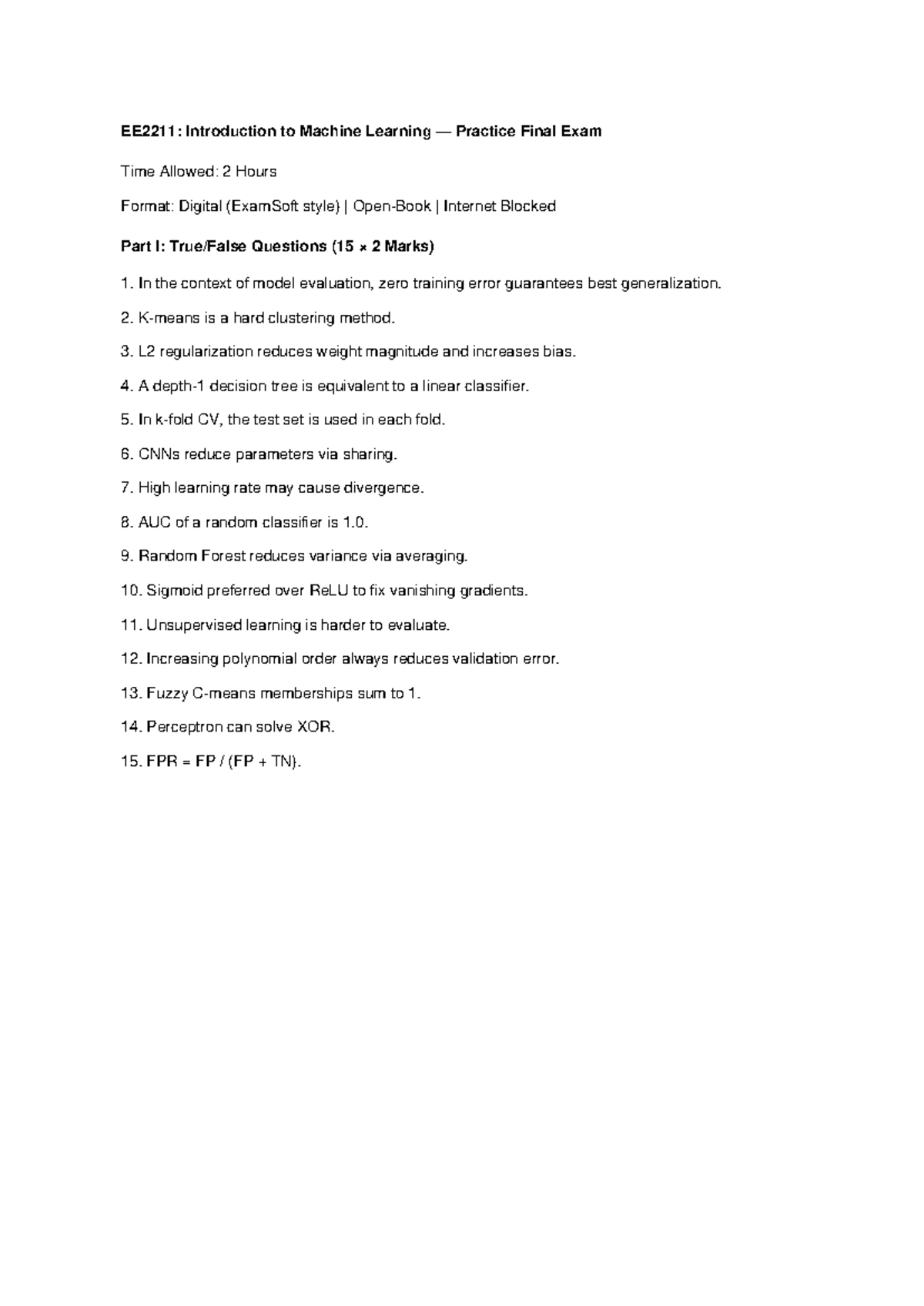 EE2211: Machine Learning Practice Final Exam Questions & MCQs - Studocu