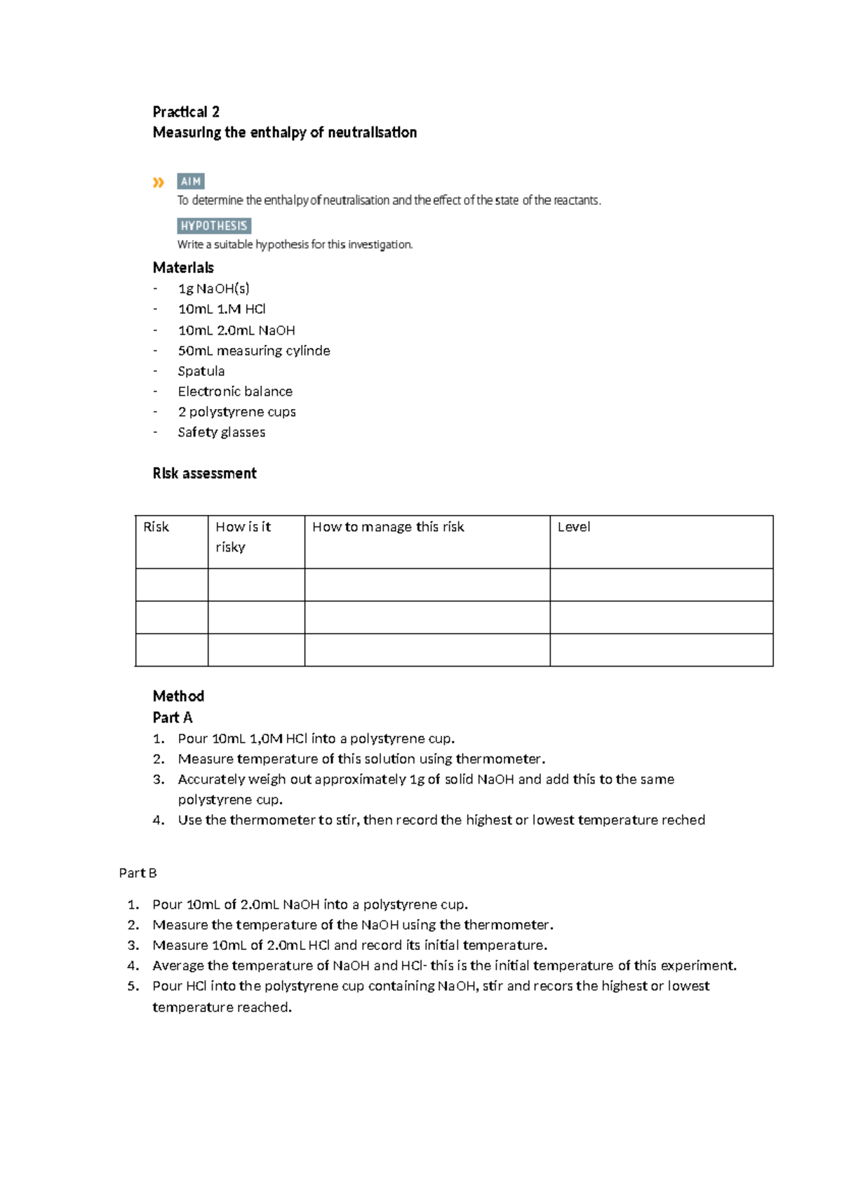 Enthalpy of Neutralisation Practical - Enthalpy of Neutralisation ...