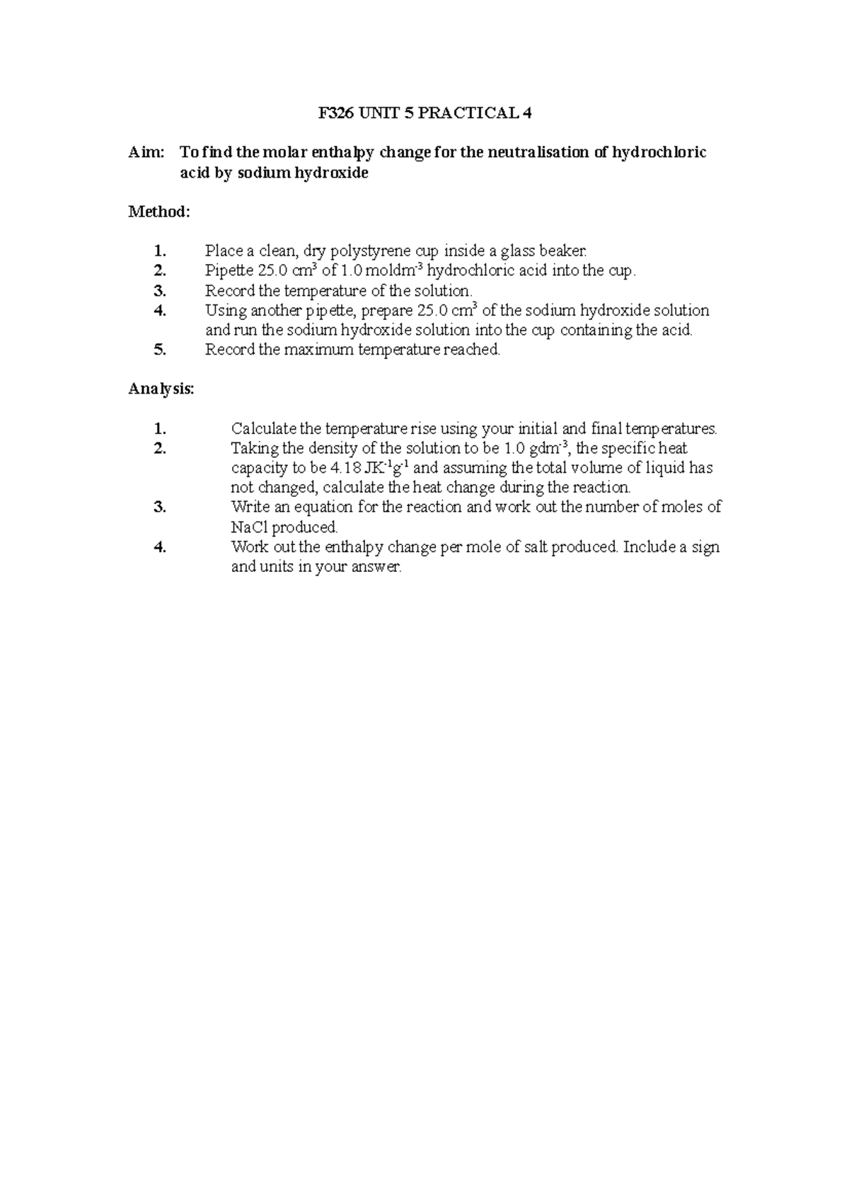 Unit 5 practical 4 - enthalpy of neutralisation - F326 UNIT 5 PRACTICAL ...
