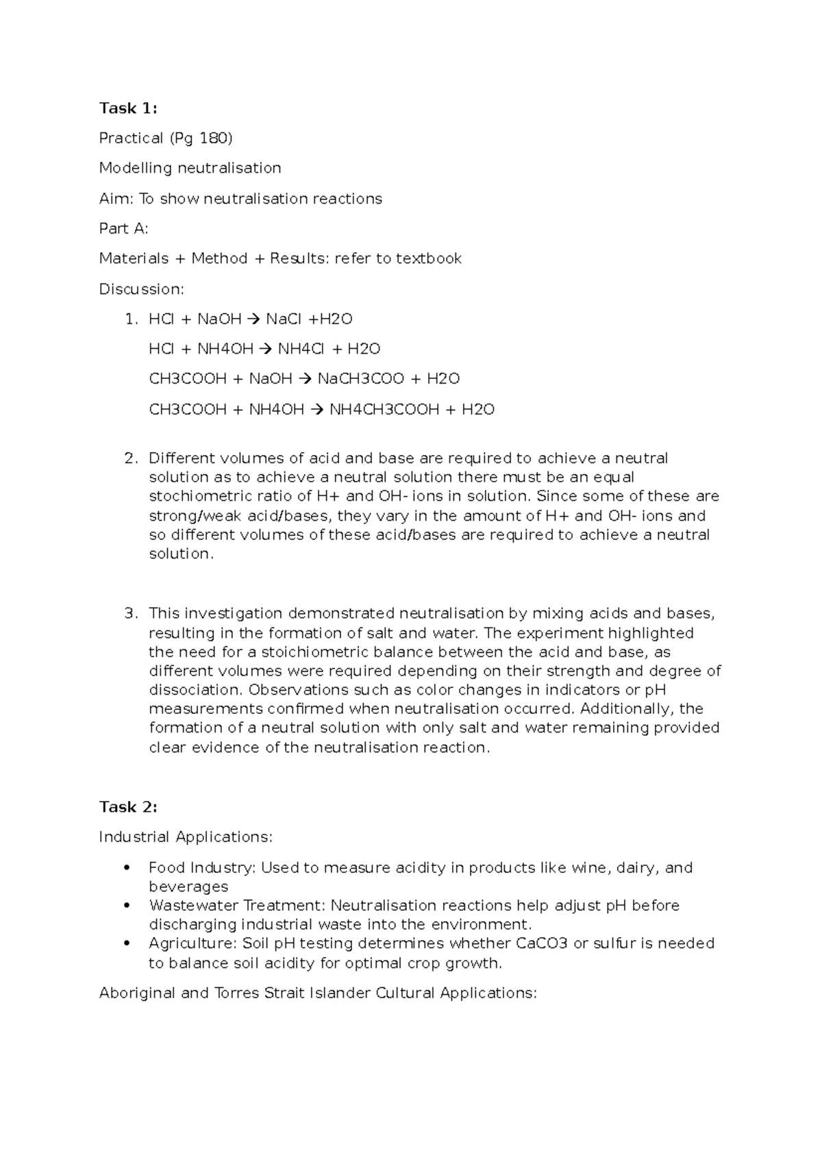 Chemistry Task 1: Practical Modelling of Neutralisation Reactions - Studocu