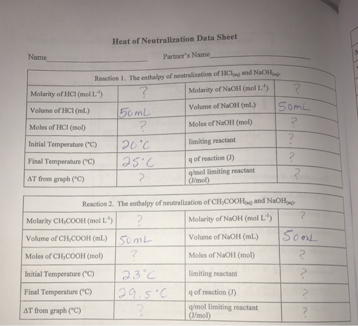 Solved Heat of Neutralization Data Sheet Name Partner's Name | Chegg.com