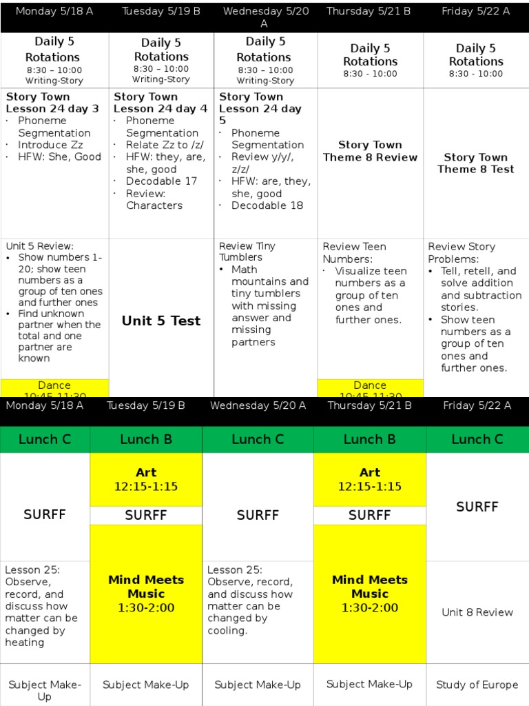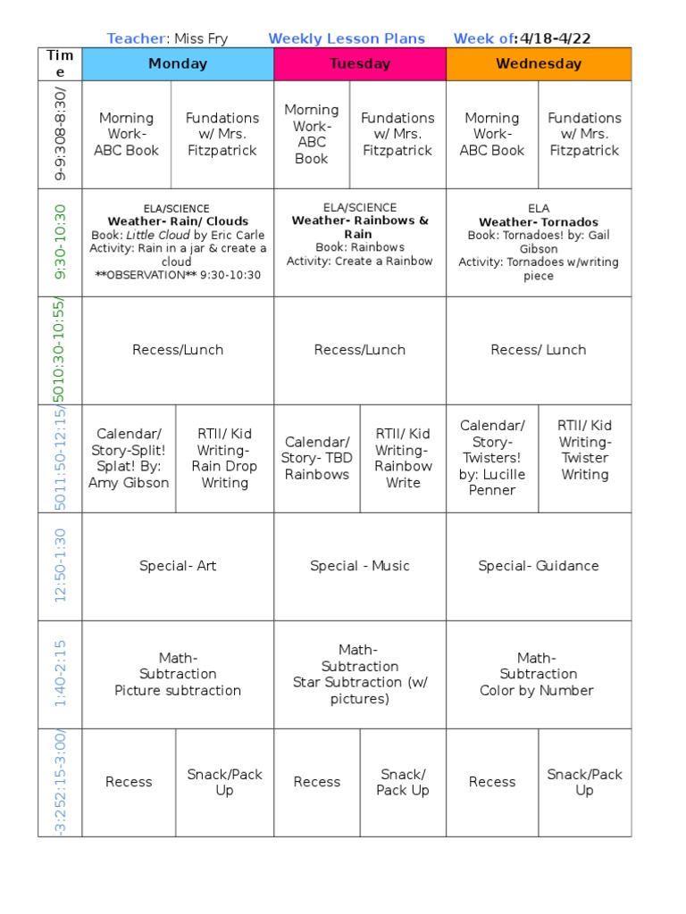 Weekly Lesson Plan Organization - Elementary - By Day, Time, and ...