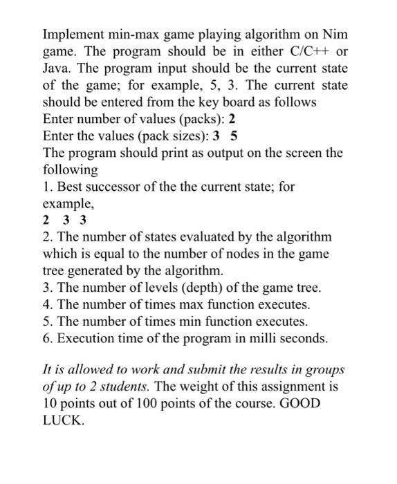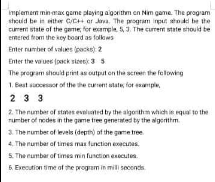 Solved Implement min-max game playing algorithm on Nim game. | Chegg.com