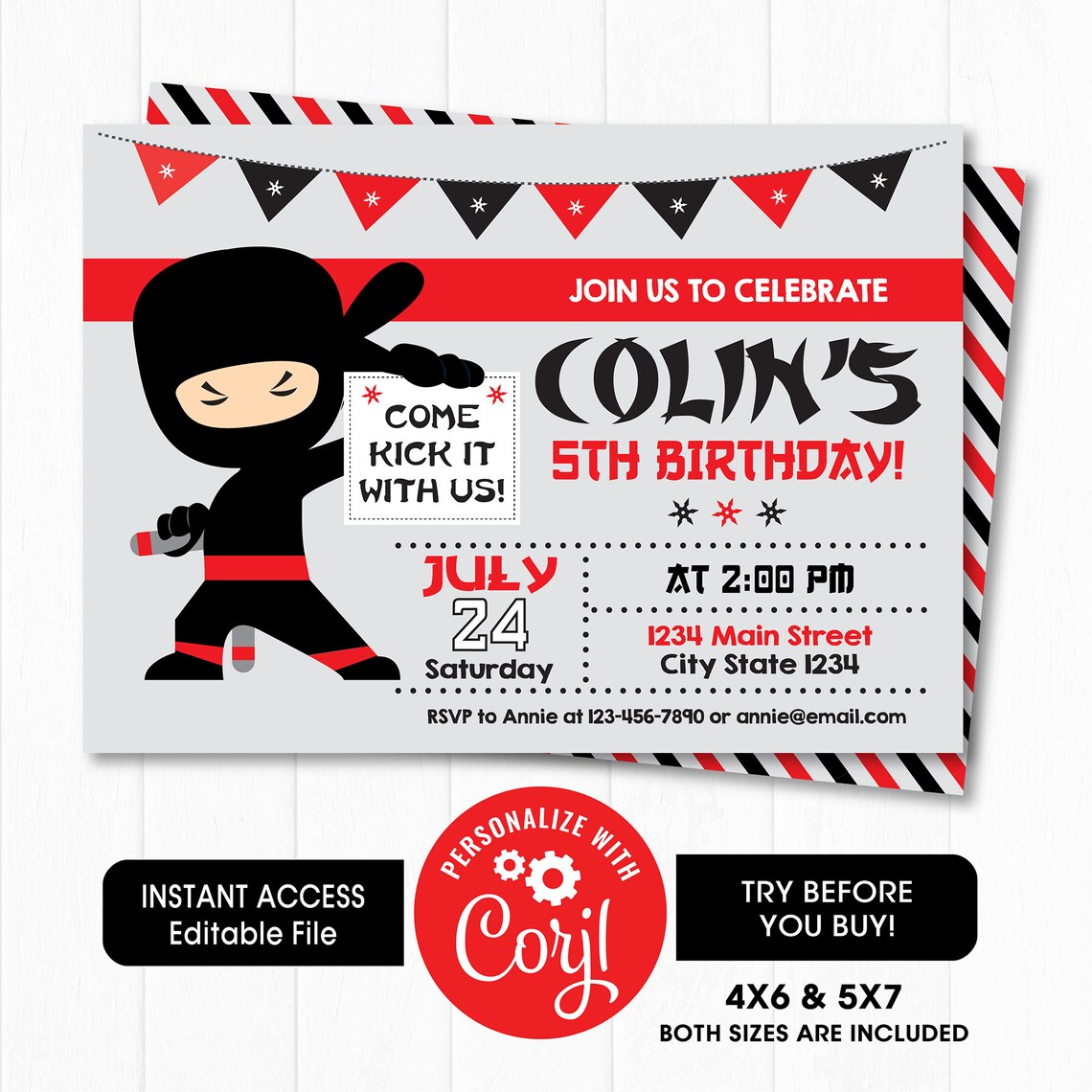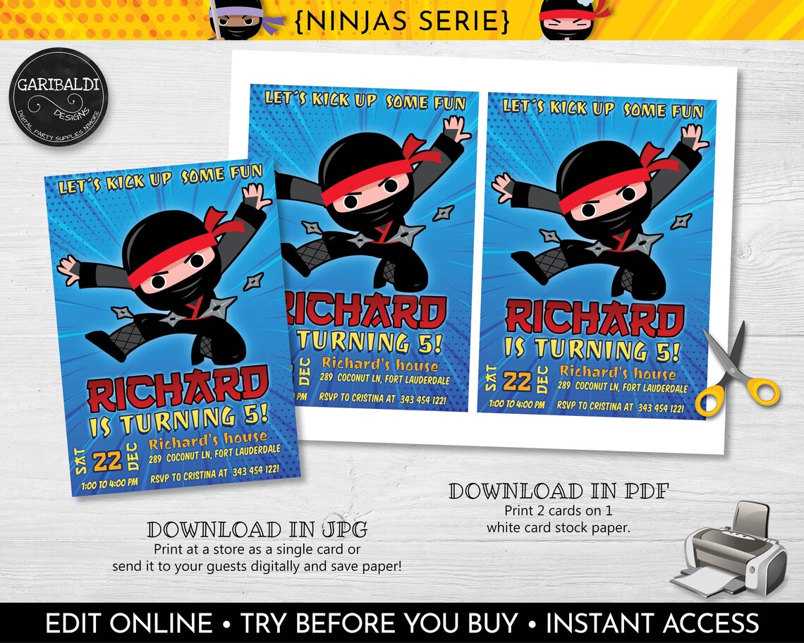 Ninja Invitation Template 5x7 and 4x6 + Free bonus. Unleash the Ninja ...