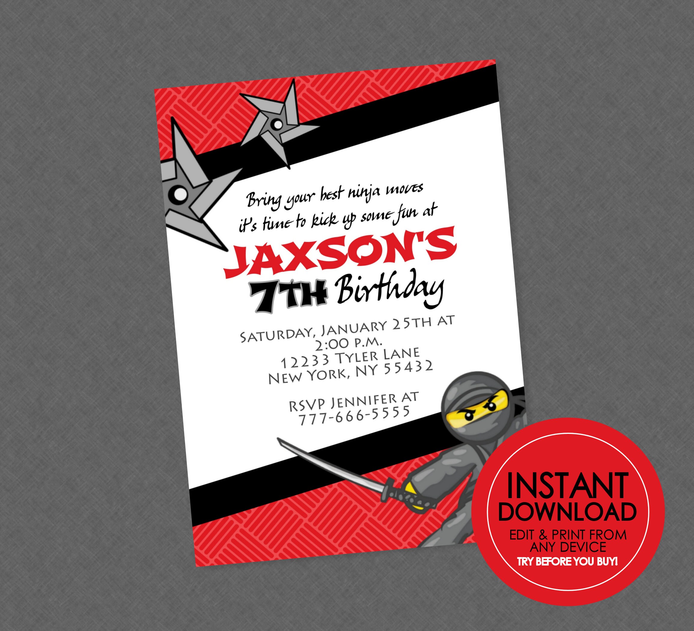 Ninja Birthday Invitation - EDITABLE INSTANT DOWNLOAD - Ninja Birthday ...