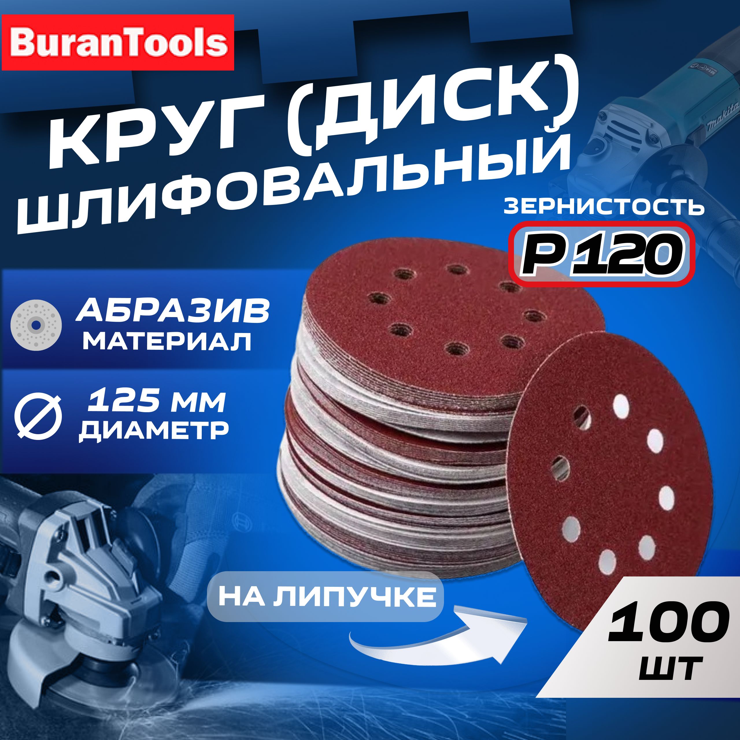 Шлифовальные круги 125мм на липучке Р120 100шт / Диск шлифовальный с ...
