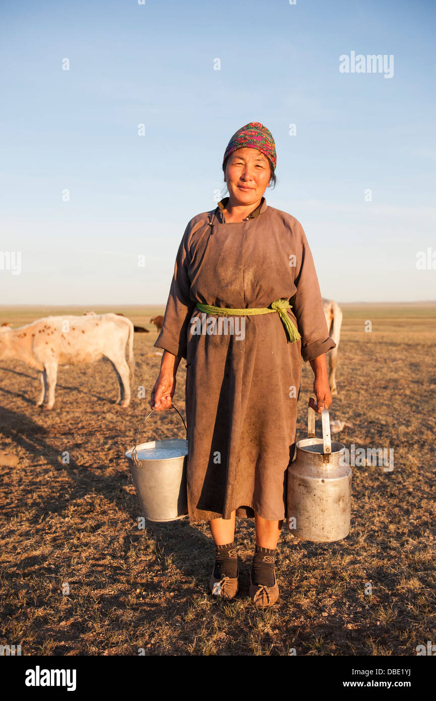 Smiling nomadic people in traditional clothes (deels) in milking pen at ...