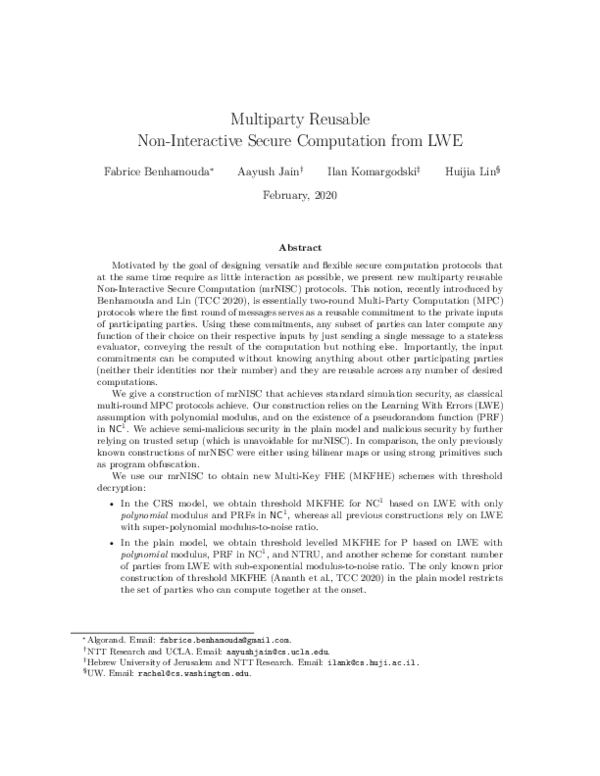 (PDF) Multiparty Reusable Non-interactive Secure Computation from LWE