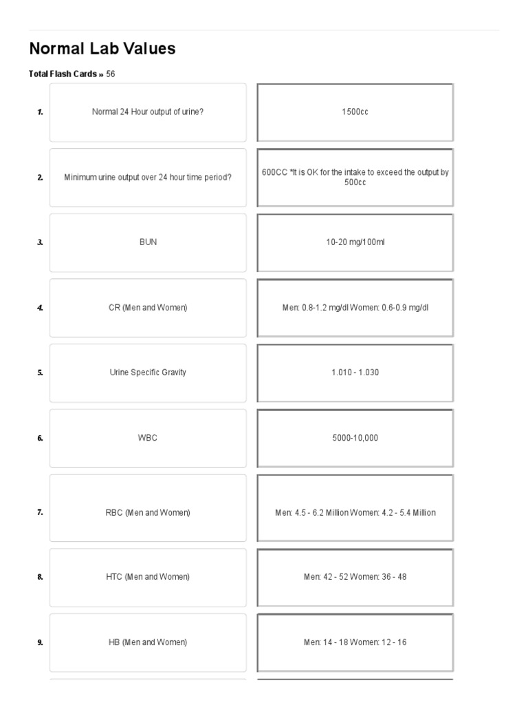 Printable Flashcard On Normal Lab Values - Free Flash Cards | PDF ...