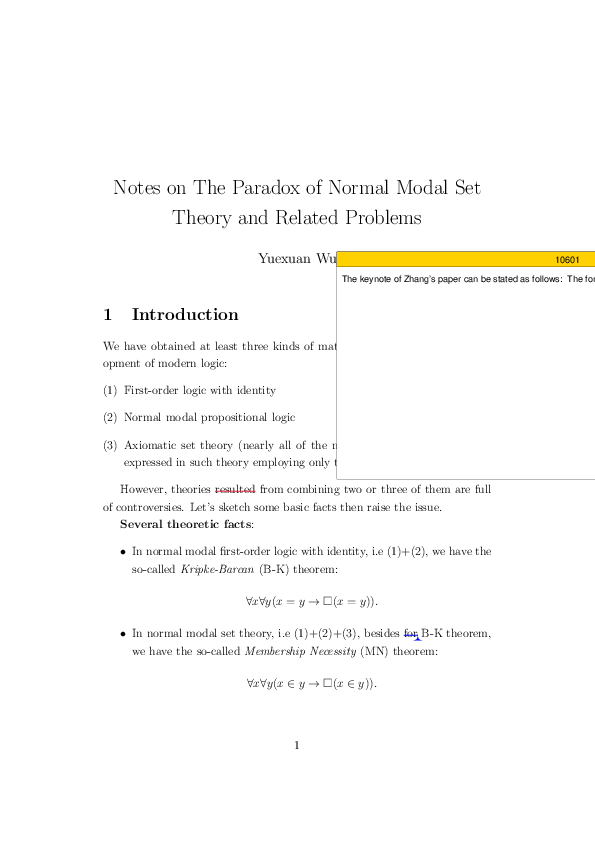 (PDF) Notes on The Paradox of Normal Modal Set Theory and Related Problems
