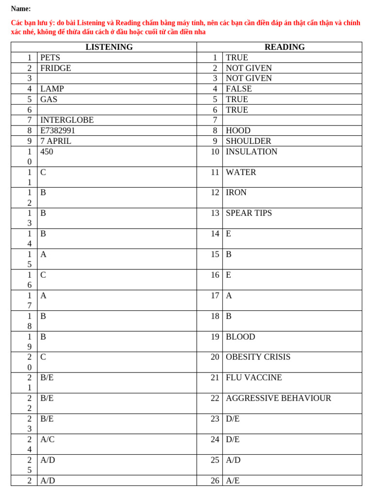 Answer Sheet Reading & Writing | PDF