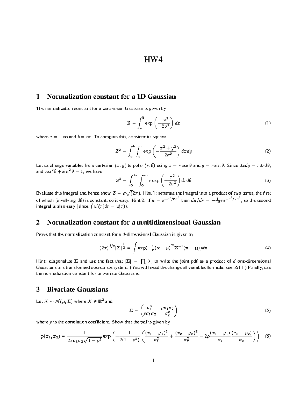 Hw4 Gausian Distributions - HW 1 Normalization constant for a 1D ...