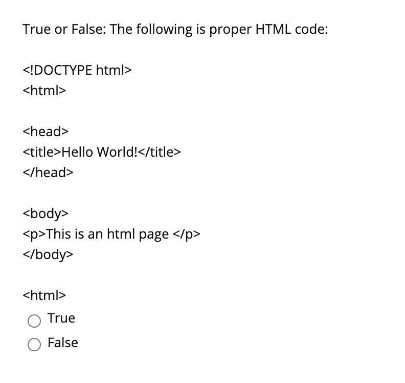 Solved True or False: The following is proper HTML code: | Chegg.com