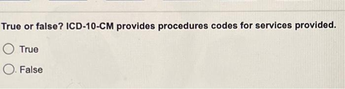 Solved True or false? ICD-10-CM provides procedures codes | Chegg.com