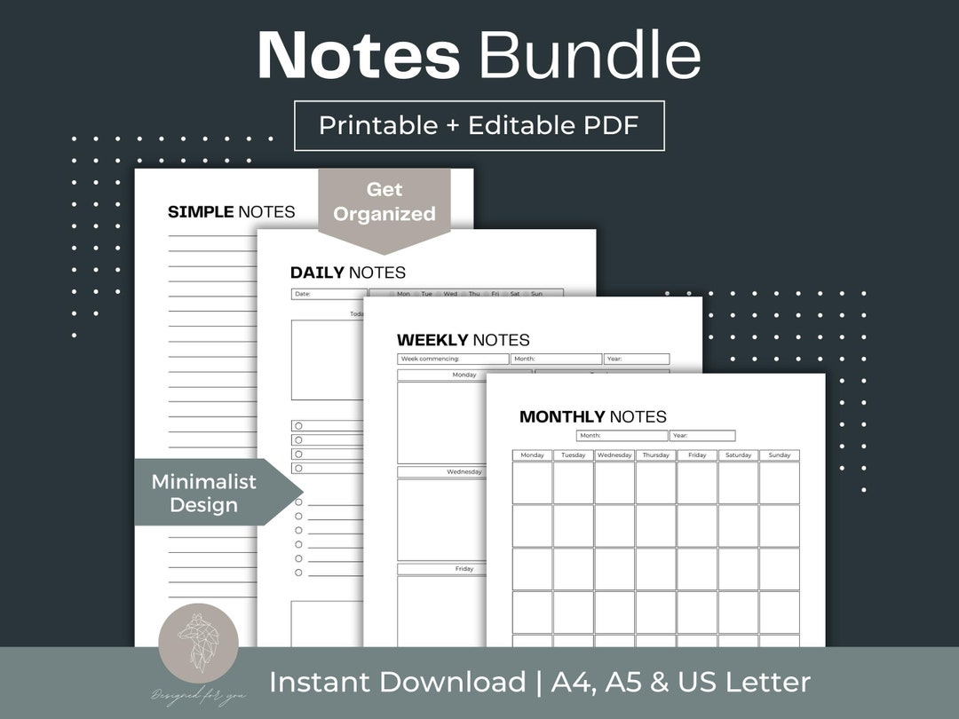 Printable Notes Bundle: Simple Daily, Weekly, Monthly (fillable PDF) - Etsy