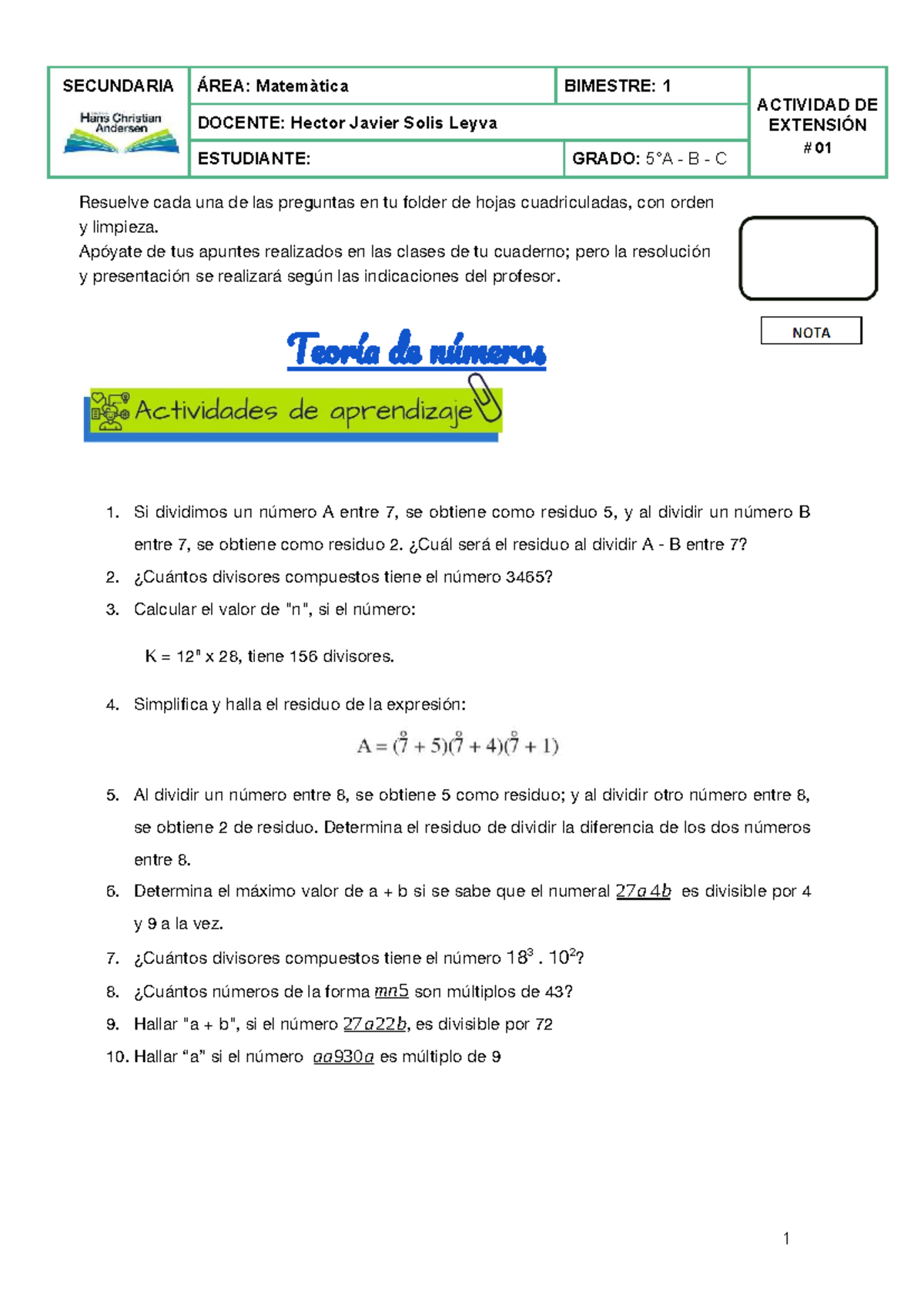 Actividad de Extensión 01: Teoría de Números 5S 1BIM 2026 - Studocu