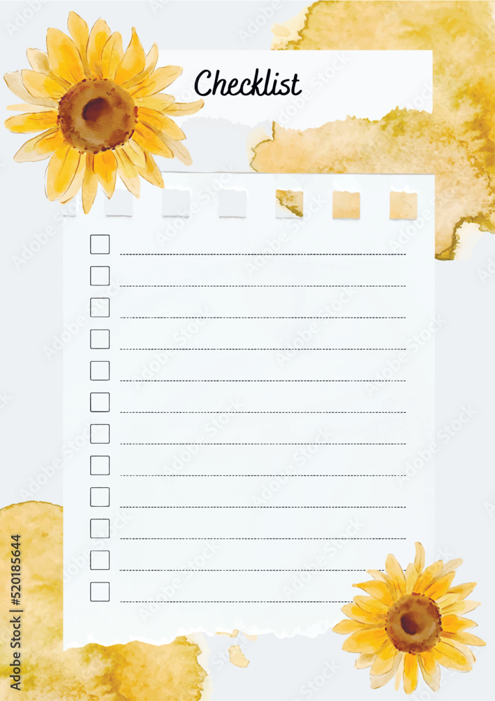 Checklist, menu, notebook, note, list with sunflowers and watercolour ...